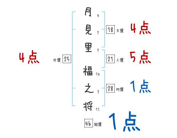天運![]() | 月見里福之将さんの天運は18画の4つ星!情熱的で剛気。忍耐力があり信頼される。 家系が持つ宿命的な運勢を表します。祖先から受け継いだ苗字ですので自分の力が及びません。家柄を象徴します。 |