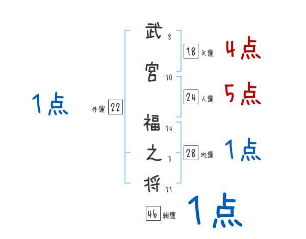 総運![]() | 武宮福之将さんの総運は46画の1つ星!迷走することが多く苦労するかも。目先のことにとらわれないように。 あなたの人生を表す1番重要な運勢です。生涯を通じて影響する総合運となり、主に50歳以降の晩年期に影響を及ぼします。 |