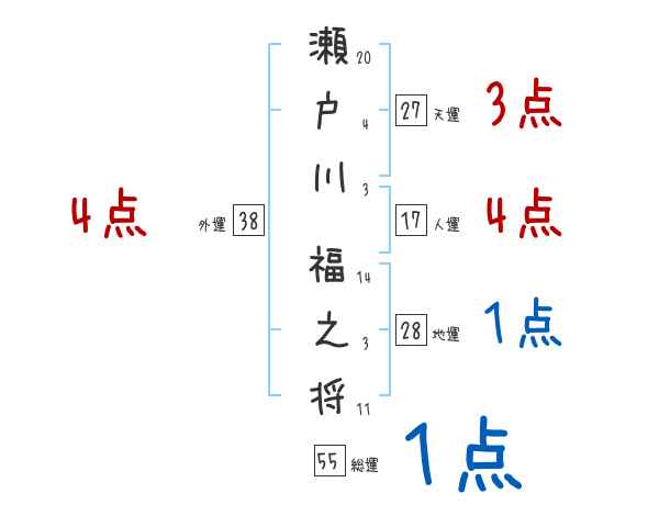 天運![]() | 瀬戸川福之将さんの天運は27画の3つ星!頭脳明晰だが強情で摩擦が多い傾向。孤立に注意。 家系が持つ宿命的な運勢を表します。祖先から受け継いだ苗字ですので自分の力が及びません。家柄を象徴します。 |