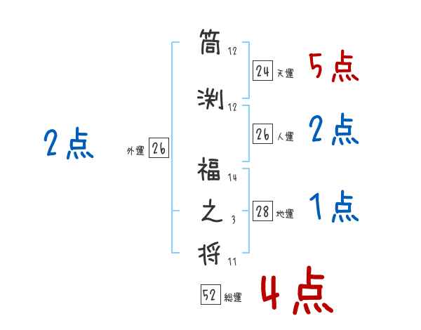 天運![]() | 筒渕福之将さんの天運は24画の5つ星!家庭運が良く順調な人生。金運にも恵まれる。 家系が持つ宿命的な運勢を表します。祖先から受け継いだ苗字ですので自分の力が及びません。家柄を象徴します。 |