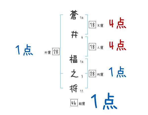 天運![]() | 蒼井福之将さんの天運は18画の4つ星!情熱的で剛気。忍耐力があり信頼される。 家系が持つ宿命的な運勢を表します。祖先から受け継いだ苗字ですので自分の力が及びません。家柄を象徴します。 |