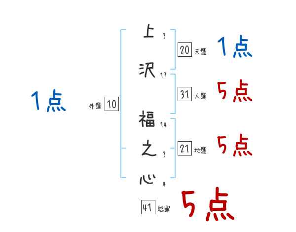 外運![]() | 上沢福之心さんの外運は10画の1つ星!不安を感じやすい傾向。ストレスを抱えないように注意しましょう。 生活面を象徴する運勢です。外部から受ける影響力を表し、結婚運、家庭運や職場、環境への順応性を表します。 |