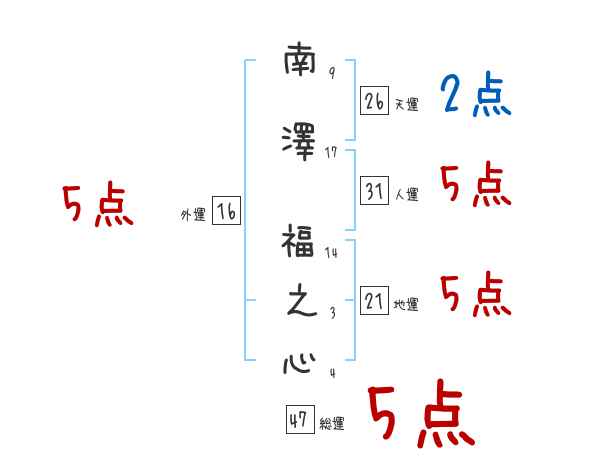 天運![]() | 南澤福之心さんの天運は26画の2つ星!波瀾万丈かも。信頼できる人を大事にしましょう。 家系が持つ宿命的な運勢を表します。祖先から受け継いだ苗字ですので自分の力が及びません。家柄を象徴します。 |