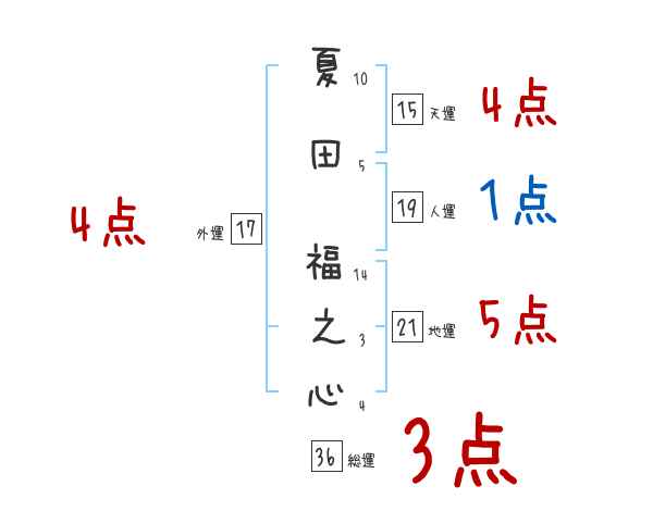 外運![]() | 夏田福之心さんの外運は17画の4つ星!積極的な行動力。地位を気づき財産を手に入れる。純粋な心と直感力。 生活面を象徴する運勢です。外部から受ける影響力を表し、結婚運、家庭運や職場、環境への順応性を表します。 |