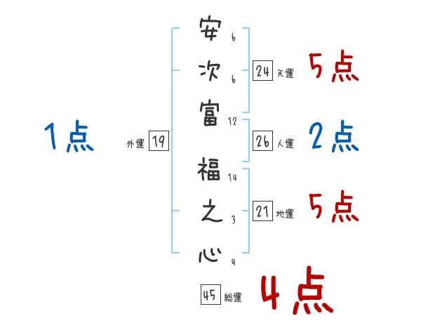 天運![]() | 安次富福之心さんの天運は24画の5つ星!家庭運が良く順調な人生。金運にも恵まれる。 家系が持つ宿命的な運勢を表します。祖先から受け継いだ苗字ですので自分の力が及びません。家柄を象徴します。 |