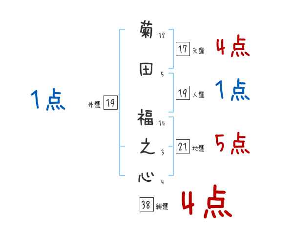 総運![]() | 菊田福之心さんの総運は38画の4つ星!温厚な性格で技術的な才能を発揮する。職人的な仕事に向いている。 あなたの人生を表す1番重要な運勢です。生涯を通じて影響する総合運となり、主に50歳以降の晩年期に影響を及ぼします。 |