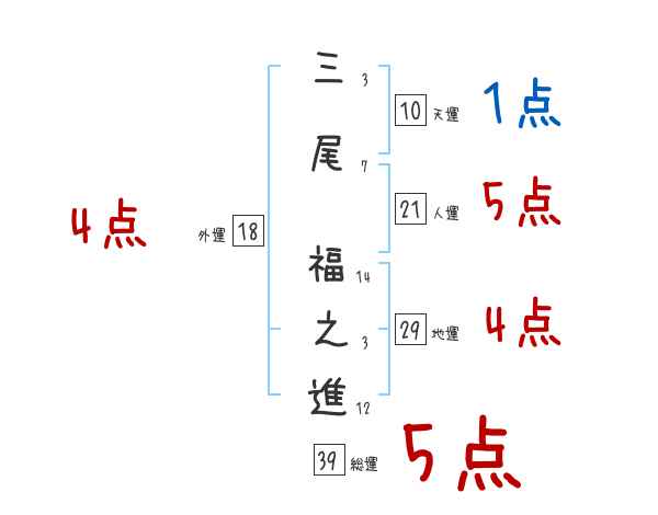 天運![]() | 三尾福之進さんの天運は10画の1つ星!不安を感じやすい傾向。ストレスを抱えないように注意しましょう。 家系が持つ宿命的な運勢を表します。祖先から受け継いだ苗字ですので自分の力が及びません。家柄を象徴します。 |