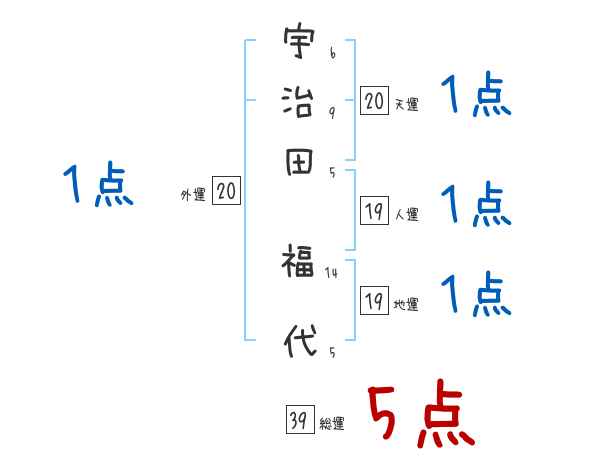 総運![]() | 宇治田福代さんの総運は39画の5つ星!社交性に優れ人望が厚い。人の上に立ち成功する。 あなたの人生を表す1番重要な運勢です。生涯を通じて影響する総合運となり、主に50歳以降の晩年期に影響を及ぼします。 |