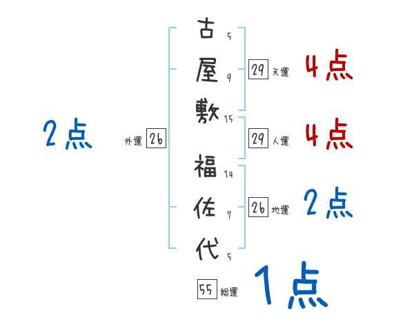 天運![]() | 古屋敷福佐代さんの天運は29画の4つ星!完全主義で才能がある。厳格な心の持ち主。 家系が持つ宿命的な運勢を表します。祖先から受け継いだ苗字ですので自分の力が及びません。家柄を象徴します。 |