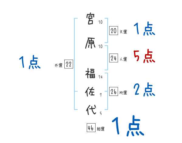 総運![]() | 宮原福佐代さんの総運は46画の1つ星!迷走することが多く苦労するかも。目先のことにとらわれないように。 あなたの人生を表す1番重要な運勢です。生涯を通じて影響する総合運となり、主に50歳以降の晩年期に影響を及ぼします。 |