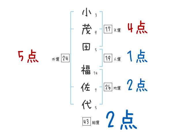 総運![]() | 小茂田福佐代さんの総運は43画の2つ星!頑固な性格で独立心が強いかも。やや非現実的で浪費に注意しましょう。 あなたの人生を表す1番重要な運勢です。生涯を通じて影響する総合運となり、主に50歳以降の晩年期に影響を及ぼします。 |