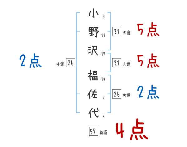 外運![]() | 小野沢福佐代さんの外運は26画の2つ星!波瀾万丈かも。信頼できる人を大事にしましょう。 生活面を象徴する運勢です。外部から受ける影響力を表し、結婚運、家庭運や職場、環境への順応性を表します。 |