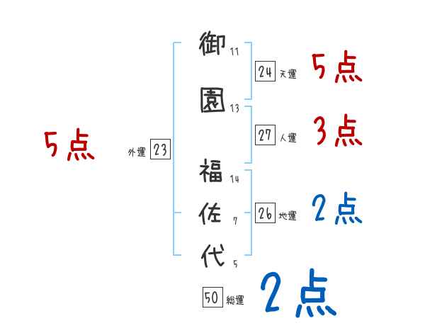 天運![]() | 御園福佐代さんの天運は24画の5つ星!家庭運が良く順調な人生。金運にも恵まれる。 家系が持つ宿命的な運勢を表します。祖先から受け継いだ苗字ですので自分の力が及びません。家柄を象徴します。 |