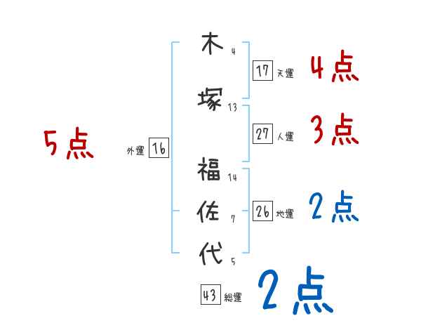 外運![]() | 木塚福佐代さんの外運は16画の5つ星!人望が厚く大きく発展する。逆転成功が見える。 生活面を象徴する運勢です。外部から受ける影響力を表し、結婚運、家庭運や職場、環境への順応性を表します。 |