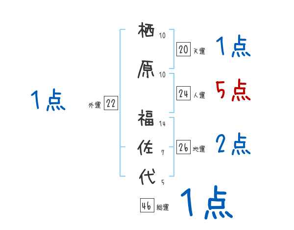 総運![]() | 栖原福佐代さんの総運は46画の1つ星!迷走することが多く苦労するかも。目先のことにとらわれないように。 あなたの人生を表す1番重要な運勢です。生涯を通じて影響する総合運となり、主に50歳以降の晩年期に影響を及ぼします。 |