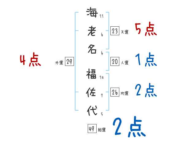 天運![]() | 海老名福佐代さんの天運は23画の5つ星!想像力に優れ活力がある。一代で成功し名誉を手に入れる。 家系が持つ宿命的な運勢を表します。祖先から受け継いだ苗字ですので自分の力が及びません。家柄を象徴します。 |