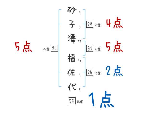 外運![]() | 砂子澤福佐代さんの外運は24画の5つ星!家庭運が良く順調な人生。金運にも恵まれる。 生活面を象徴する運勢です。外部から受ける影響力を表し、結婚運、家庭運や職場、環境への順応性を表します。 |