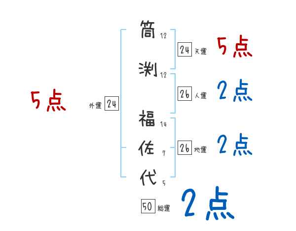 天運![]() | 筒渕福佐代さんの天運は24画の5つ星!家庭運が良く順調な人生。金運にも恵まれる。 家系が持つ宿命的な運勢を表します。祖先から受け継いだ苗字ですので自分の力が及びません。家柄を象徴します。 |