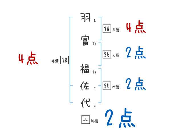 天運![]() | 羽富福佐代さんの天運は18画の4つ星!情熱的で剛気。忍耐力があり信頼される。 家系が持つ宿命的な運勢を表します。祖先から受け継いだ苗字ですので自分の力が及びません。家柄を象徴します。 |