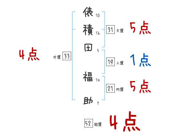 総運![]() | 俵積田福助さんの総運は52画の4つ星!先見性と独創性に優れ考える力がある。強運の持ち主。 あなたの人生を表す1番重要な運勢です。生涯を通じて影響する総合運となり、主に50歳以降の晩年期に影響を及ぼします。 |