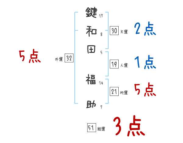 天運![]() | 鍵和田福助さんの天運は30画の2つ星!浮き沈みの激しさに注意しましょう。 家系が持つ宿命的な運勢を表します。祖先から受け継いだ苗字ですので自分の力が及びません。家柄を象徴します。 |