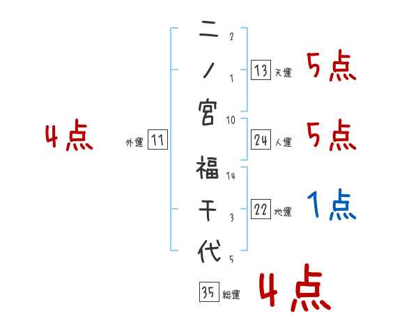 天運![]() | 二ノ宮福千代さんの天運は13画の5つ星!才能に恵まれ人気がある。名声を手に入れる。円満な人生。 家系が持つ宿命的な運勢を表します。祖先から受け継いだ苗字ですので自分の力が及びません。家柄を象徴します。 |