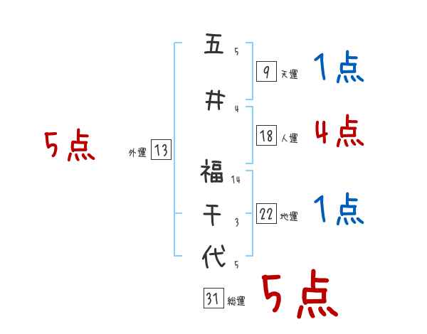 総運![]() | 五井福千代さんの総運は31画の5つ星!社交性があり判断力に優れる。順風満帆な人生で円満な生活。 あなたの人生を表す1番重要な運勢です。生涯を通じて影響する総合運となり、主に50歳以降の晩年期に影響を及ぼします。 |