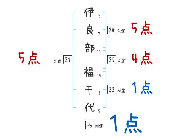 天運![]() | 伊良部福千代さんの天運は24画の5つ星!家庭運が良く順調な人生。金運にも恵まれる。 家系が持つ宿命的な運勢を表します。祖先から受け継いだ苗字ですので自分の力が及びません。家柄を象徴します。 |