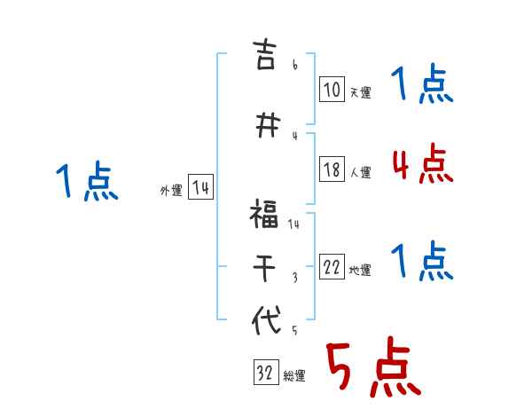 総運![]() | 吉井福千代さんの総運は32画の5つ星!柔軟性があり成功する。チャンスが多く金運が良い。 あなたの人生を表す1番重要な運勢です。生涯を通じて影響する総合運となり、主に50歳以降の晩年期に影響を及ぼします。 |
