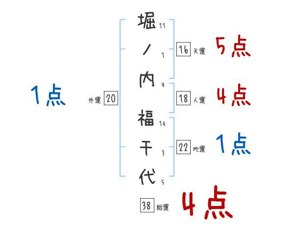 天運![]() | 堀ノ内福千代さんの天運は16画の5つ星!人望が厚く大きく発展する。逆転成功が見える。 家系が持つ宿命的な運勢を表します。祖先から受け継いだ苗字ですので自分の力が及びません。家柄を象徴します。 |