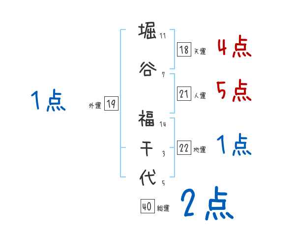 天運![]() | 堀谷福千代さんの天運は18画の4つ星!情熱的で剛気。忍耐力があり信頼される。 家系が持つ宿命的な運勢を表します。祖先から受け継いだ苗字ですので自分の力が及びません。家柄を象徴します。 |