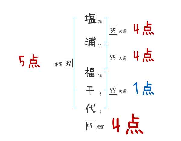 外運![]() | 塩浦福千代さんの外運は32画の5つ星!柔軟性があり成功する。チャンスが多く金運が良い。 生活面を象徴する運勢です。外部から受ける影響力を表し、結婚運、家庭運や職場、環境への順応性を表します。 |