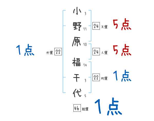 人運![]() | 小野原福千代さんの人運は24画の5つ星!家庭運が良く順調な人生。金運にも恵まれる。 性格や才能などを表す2番目に重要な運勢です。人間関係や協調性、社会的な成功に影響します。主に20歳から50歳ぐらいまでの中年期の運勢を表します。 |