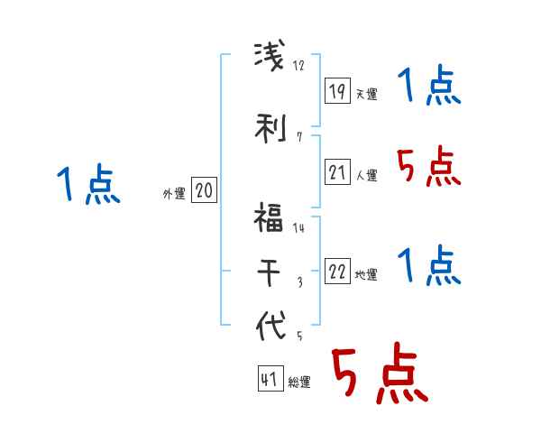 天運![]() | 浅利福千代さんの天運は19画の1つ星!優れた才能を持ちますが、協調性が足りないことも。周りの人と協力する事を意識しましょう。 家系が持つ宿命的な運勢を表します。祖先から受け継いだ苗字ですので自分の力が及びません。家柄を象徴します。 |