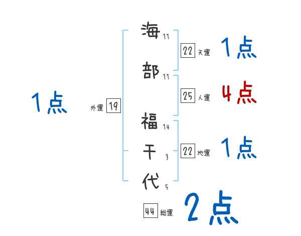 外運![]() | 海部福千代さんの外運は19画の1つ星!優れた才能を持ちますが、協調性が足りないことも。周りの人と協力する事を意識しましょう。 生活面を象徴する運勢です。外部から受ける影響力を表し、結婚運、家庭運や職場、環境への順応性を表します。 |