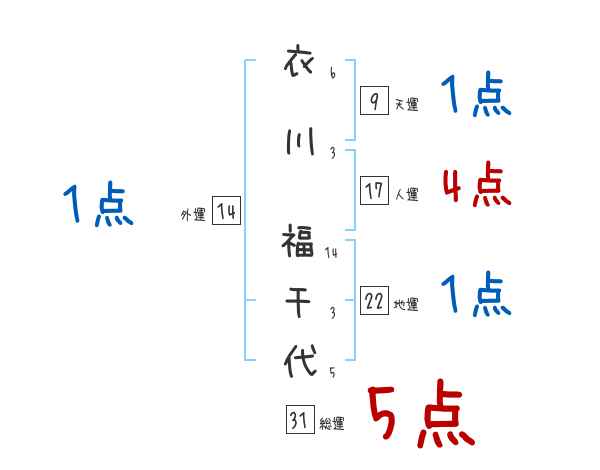 外運![]() | 衣川福千代さんの外運は14画の1つ星!人に対して優しいがストレスを溜め込みがち。人間関係のトラブルを避けるよう気をつけましょう。 生活面を象徴する運勢です。外部から受ける影響力を表し、結婚運、家庭運や職場、環境への順応性を表します。 |