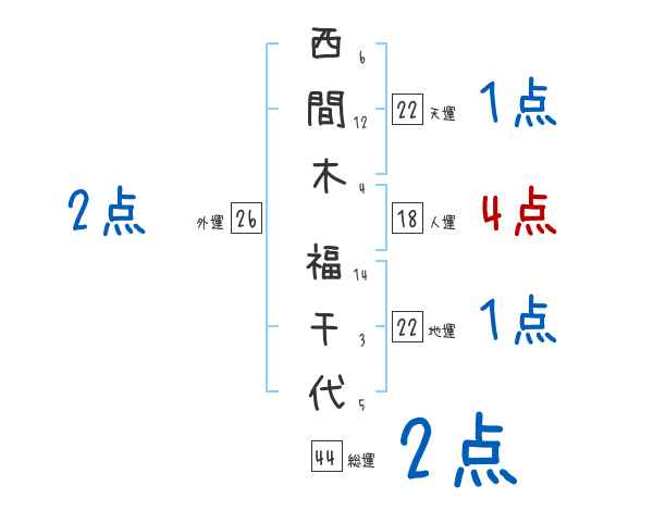 天運![]() | 西間木福千代さんの天運は22画の1つ星!努力することが苦手ないっぽう手先が器用。芸術性にも優れる。 家系が持つ宿命的な運勢を表します。祖先から受け継いだ苗字ですので自分の力が及びません。家柄を象徴します。 |