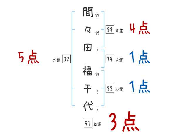 外運![]() | 間々田福千代さんの外運は32画の5つ星!柔軟性があり成功する。チャンスが多く金運が良い。 生活面を象徴する運勢です。外部から受ける影響力を表し、結婚運、家庭運や職場、環境への順応性を表します。 |