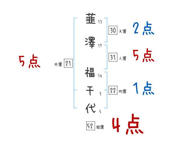 天運![]() | 韮澤福千代さんの天運は30画の2つ星!浮き沈みの激しさに注意しましょう。 家系が持つ宿命的な運勢を表します。祖先から受け継いだ苗字ですので自分の力が及びません。家柄を象徴します。 |