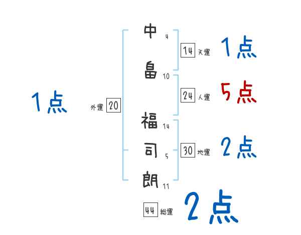 人運![]() | 中畠福司朗さんの人運は24画の5つ星!家庭運が良く順調な人生。金運にも恵まれる。 性格や才能などを表す2番目に重要な運勢です。人間関係や協調性、社会的な成功に影響します。主に20歳から50歳ぐらいまでの中年期の運勢を表します。 |
