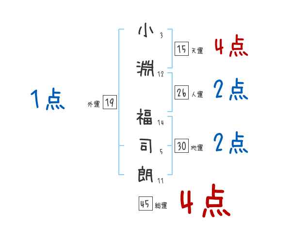 天運![]() | 小淵福司朗さんの天運は15画の4つ星!人徳があり出世する。順調に物事を進め円満な人生。 家系が持つ宿命的な運勢を表します。祖先から受け継いだ苗字ですので自分の力が及びません。家柄を象徴します。 |