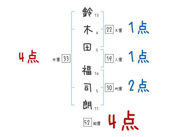 外運![]() | 鈴木田福司朗さんの外運は33画の4つ星!権力志向でプライドが高い。勇気があり運を切り開き成功する。 生活面を象徴する運勢です。外部から受ける影響力を表し、結婚運、家庭運や職場、環境への順応性を表します。 |