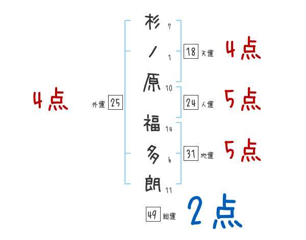 天運![]() | 杉ノ原福多朗さんの天運は18画の4つ星!情熱的で剛気。忍耐力があり信頼される。 家系が持つ宿命的な運勢を表します。祖先から受け継いだ苗字ですので自分の力が及びません。家柄を象徴します。 |