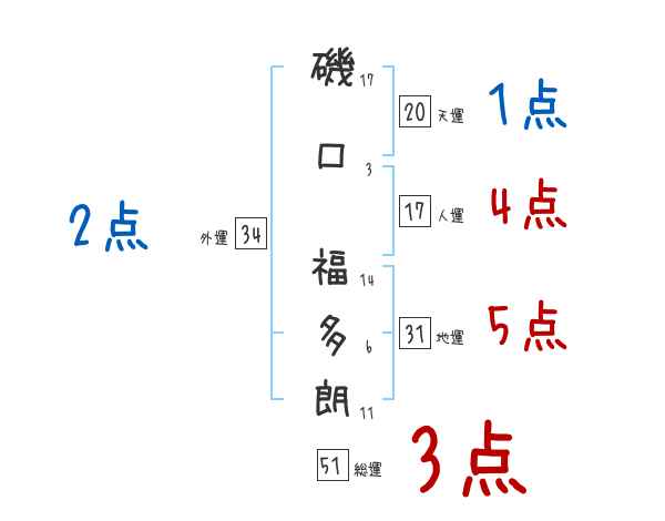 外運![]() | 磯口福多朗さんの外運は34画の2つ星!独創性に優れるが、自尊心が強く災難に注意しましょう。 生活面を象徴する運勢です。外部から受ける影響力を表し、結婚運、家庭運や職場、環境への順応性を表します。 |