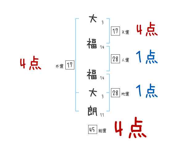 天運![]() | 大福福大朗さんの天運は17画の4つ星!積極的な行動力。地位を気づき財産を手に入れる。純粋な心と直感力。 家系が持つ宿命的な運勢を表します。祖先から受け継いだ苗字ですので自分の力が及びません。家柄を象徴します。 |