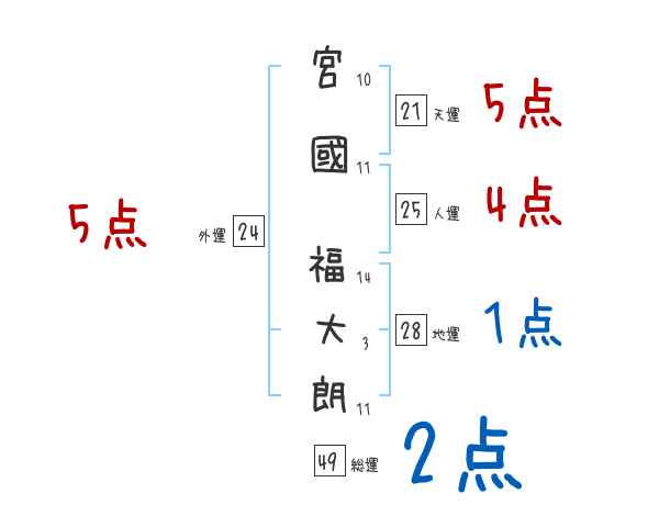 外運![]() | 宮國福大朗さんの外運は24画の5つ星!家庭運が良く順調な人生。金運にも恵まれる。 生活面を象徴する運勢です。外部から受ける影響力を表し、結婚運、家庭運や職場、環境への順応性を表します。 |