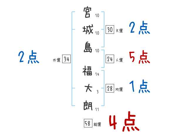 天運![]() | 宮城島福大朗さんの天運は30画の2つ星!浮き沈みの激しさに注意しましょう。 家系が持つ宿命的な運勢を表します。祖先から受け継いだ苗字ですので自分の力が及びません。家柄を象徴します。 |