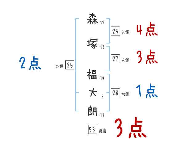 総運![]() | 森塚福大朗さんの総運は53画の3つ星!やや見栄っ張りで虚栄心がある。散財に注意。 あなたの人生を表す1番重要な運勢です。生涯を通じて影響する総合運となり、主に50歳以降の晩年期に影響を及ぼします。 |