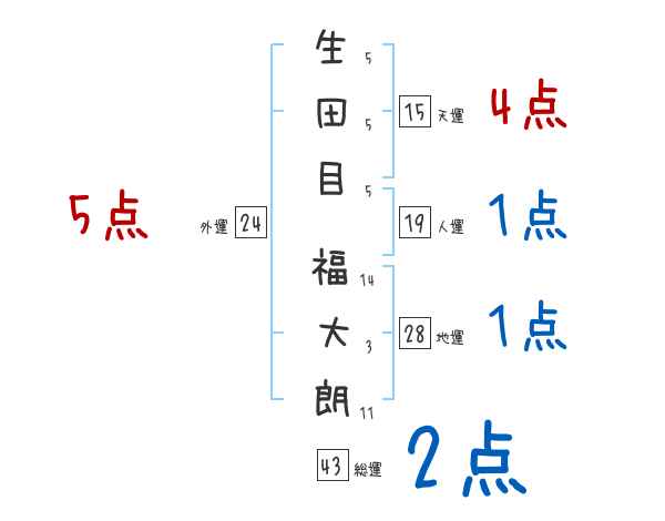 外運![]() | 生田目福大朗さんの外運は24画の5つ星!家庭運が良く順調な人生。金運にも恵まれる。 生活面を象徴する運勢です。外部から受ける影響力を表し、結婚運、家庭運や職場、環境への順応性を表します。 |