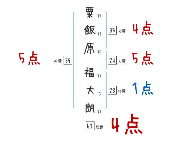 外運![]() | 粟飯原福大朗さんの外運は39画の5つ星!社交性に優れ人望が厚い。人の上に立ち成功する。 生活面を象徴する運勢です。外部から受ける影響力を表し、結婚運、家庭運や職場、環境への順応性を表します。 |